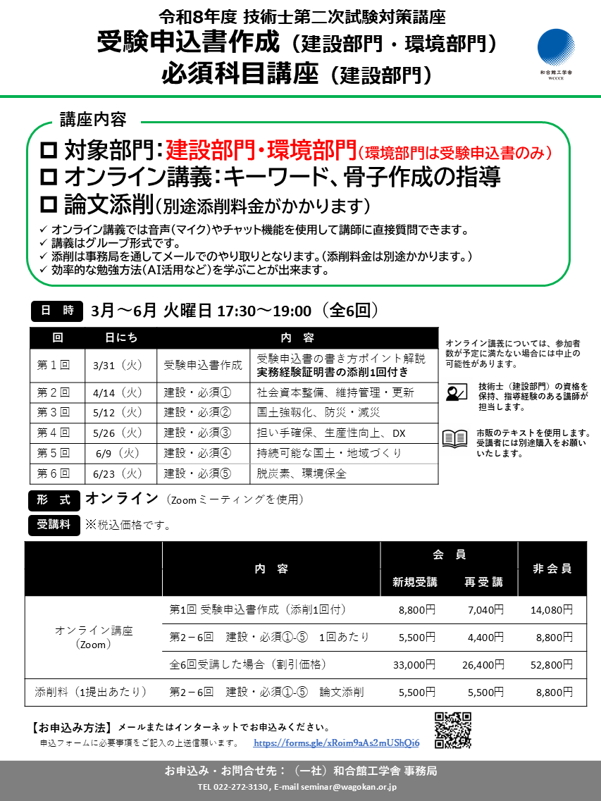 和合館工学舎では令和8年度技術士第二次試験対策講座をオンライン開講いたします。本講座は、初受験の方にも分かりやすい内容となっています。受験申込書の書き方を学びたい方、建設部門の必須科目の重要テーマについて重点的に学びたい方々のご受講をお待ちしております!