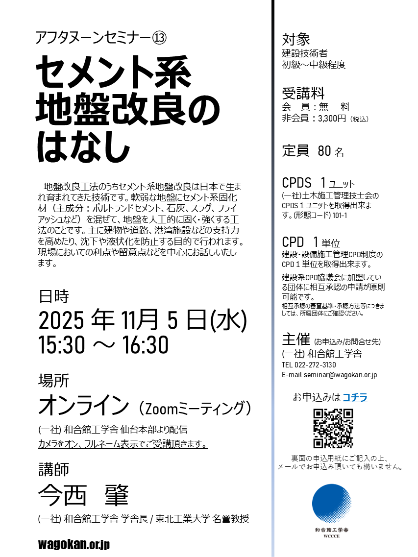 和合館工学舎では、令和7年11月5日(水)15時半より、アフタヌーンセミナー⑬「セメント系地盤改良のはなし」をオンライン開催致します。