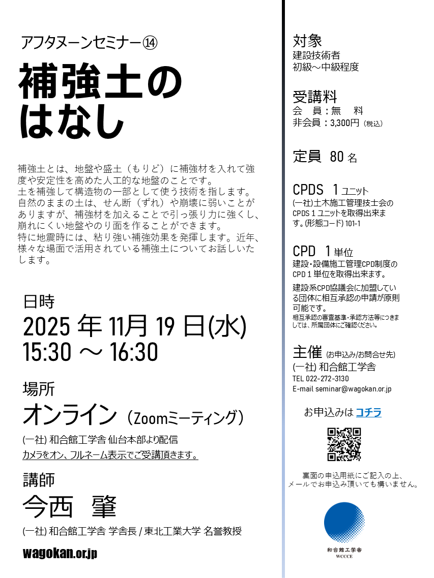 和合館工学舎では、令和7年11月19日(水)17時半より、アフタヌーンセミナー⑭「補強土のはなし」をオンライン開催致します。