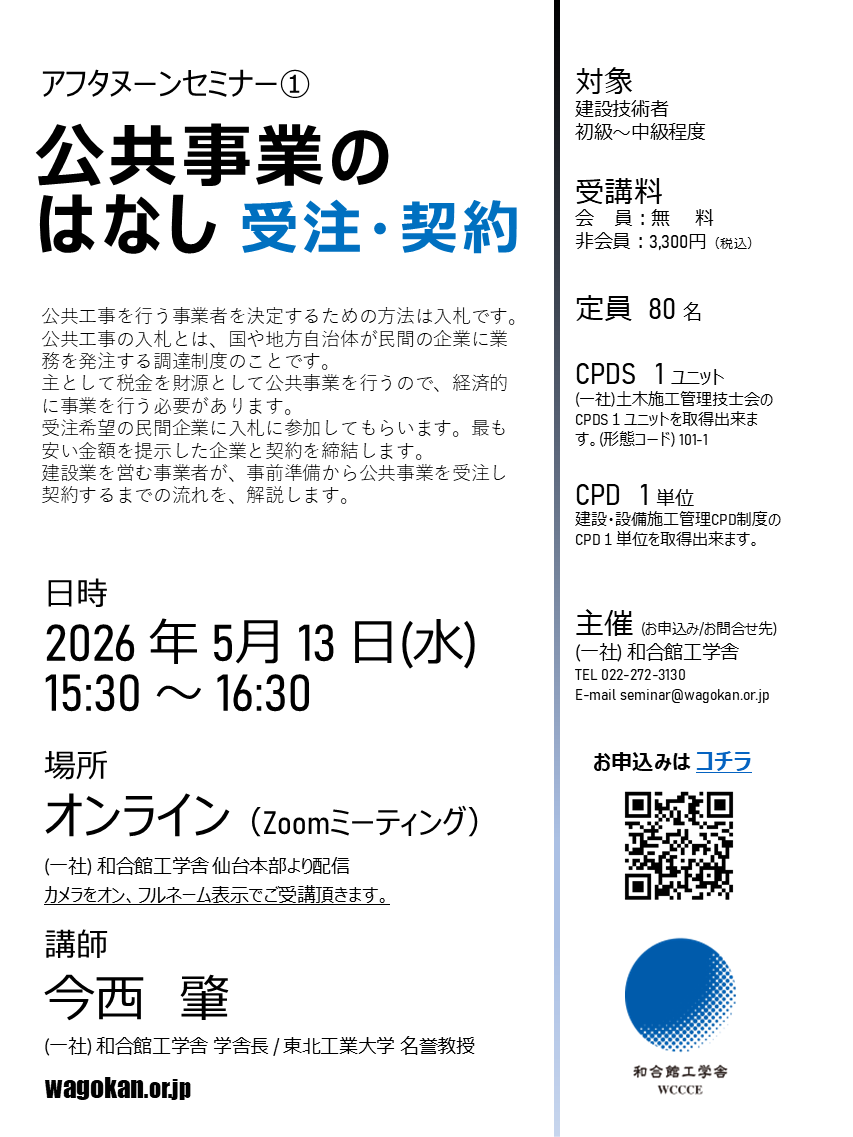 和合館工学舎では、令和8年5月13日(水)15時半より、アフタヌーンセミナー①「公共事業のはなし 受注・契約」をオンライン開催致します。