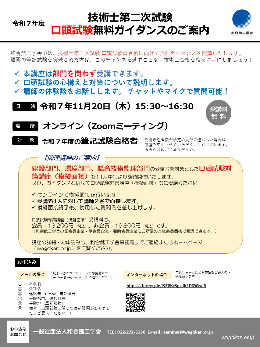 【関連講座】技術士第二次試験口頭試験対策講座(模擬面接)「令和7年度技術士第二次試験口頭試験対策講座(模擬面接)」開講のご案内(受講者募集中)