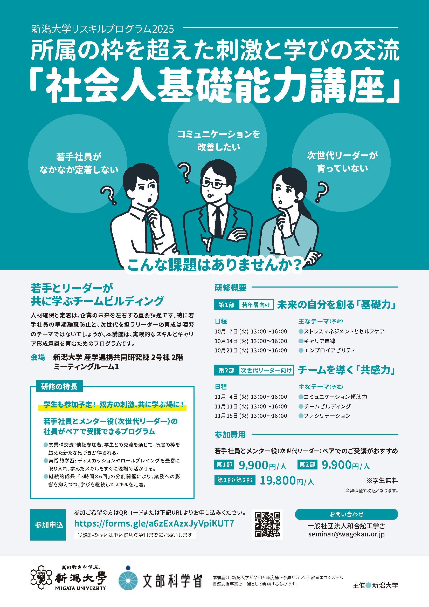 和合館工学舎では、新潟大学が受託している令和6年度補正予算リカレント教育エコシステム構築支援事業の一部を委託しております。