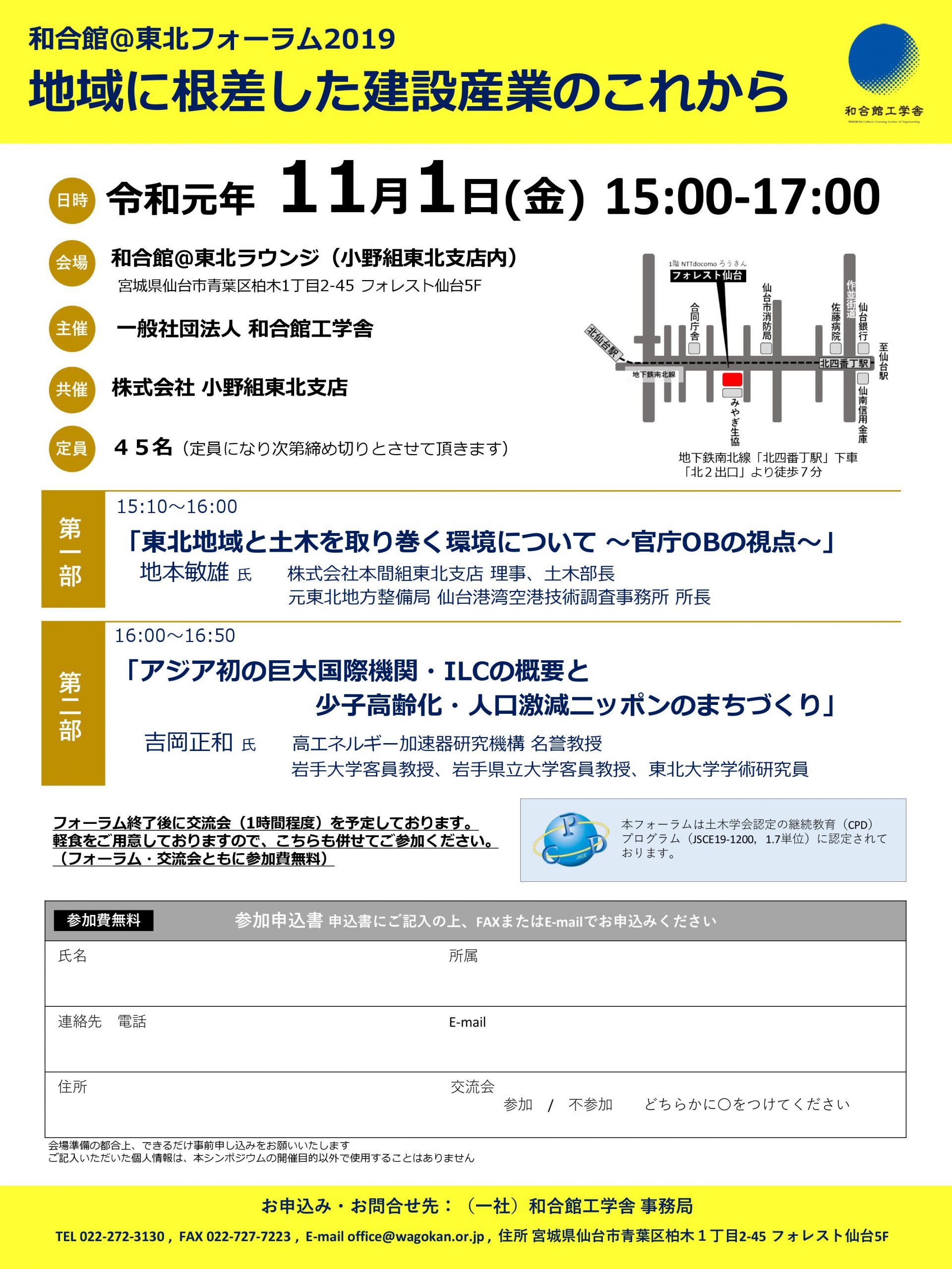 和合館工学舎では、和合館@東北フォーラム2019「地域に根差した建設産業のこれから」を令和元年11月1日(金)に開催致します。
