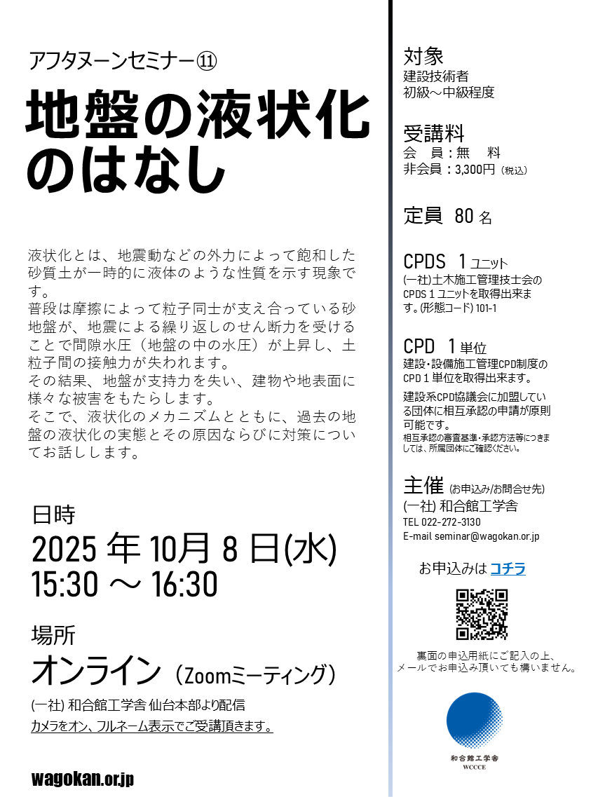 和合館工学舎では、令和7年10月8日(水)15時半より、アフタヌーンセミナー⑪「地盤の液状化のはなし」をオンライン開催致します。