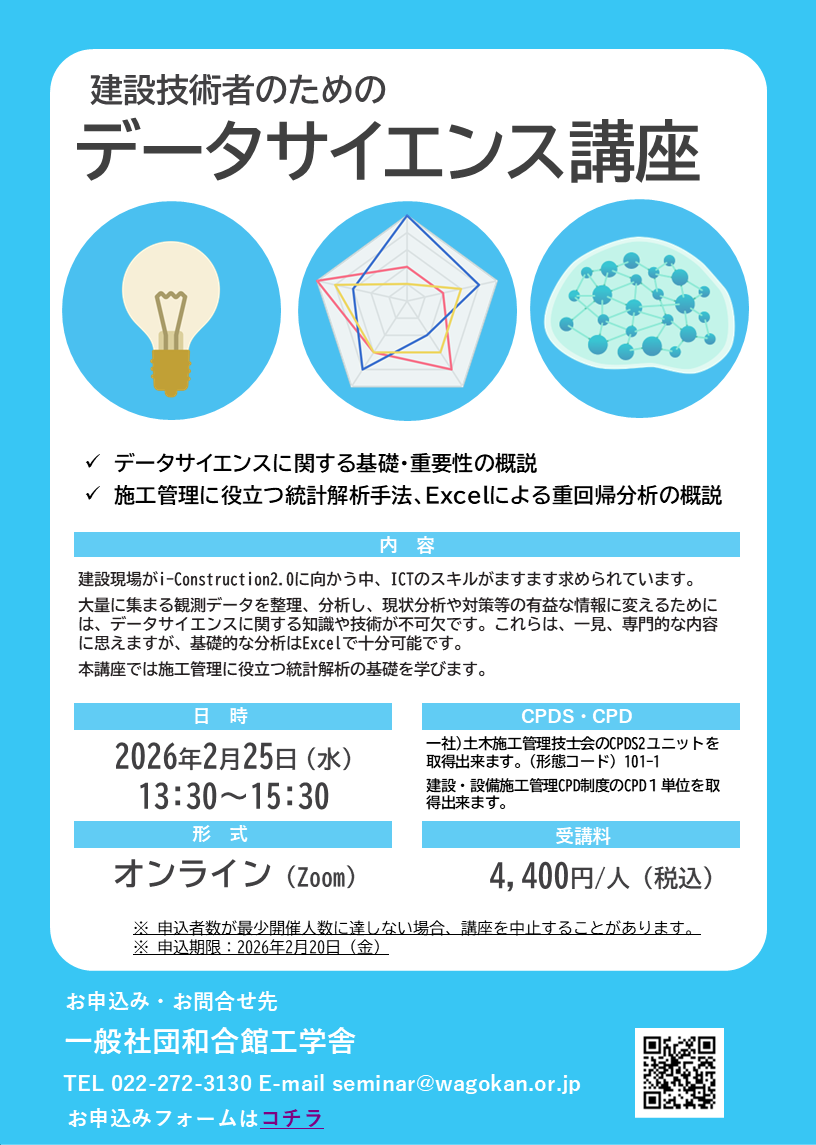 和合館工学舎では、令和8年2月25日(水)13時半より、建設技術者のためのデータサイエンス講座をオンライン開催いたします。